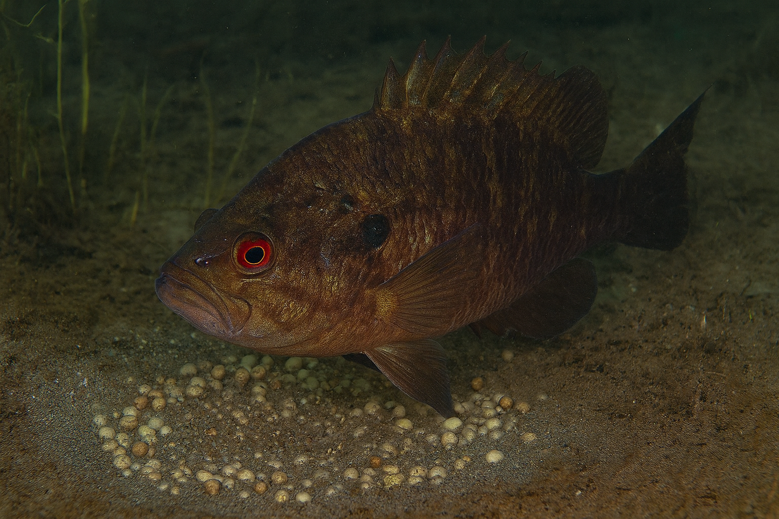 A Warmouth Sunfish (Lepomis gulosus) guarding its nest of eggs on a sandy bottom, showcasing its dark mottled body and vivid red eyes in shallow water.